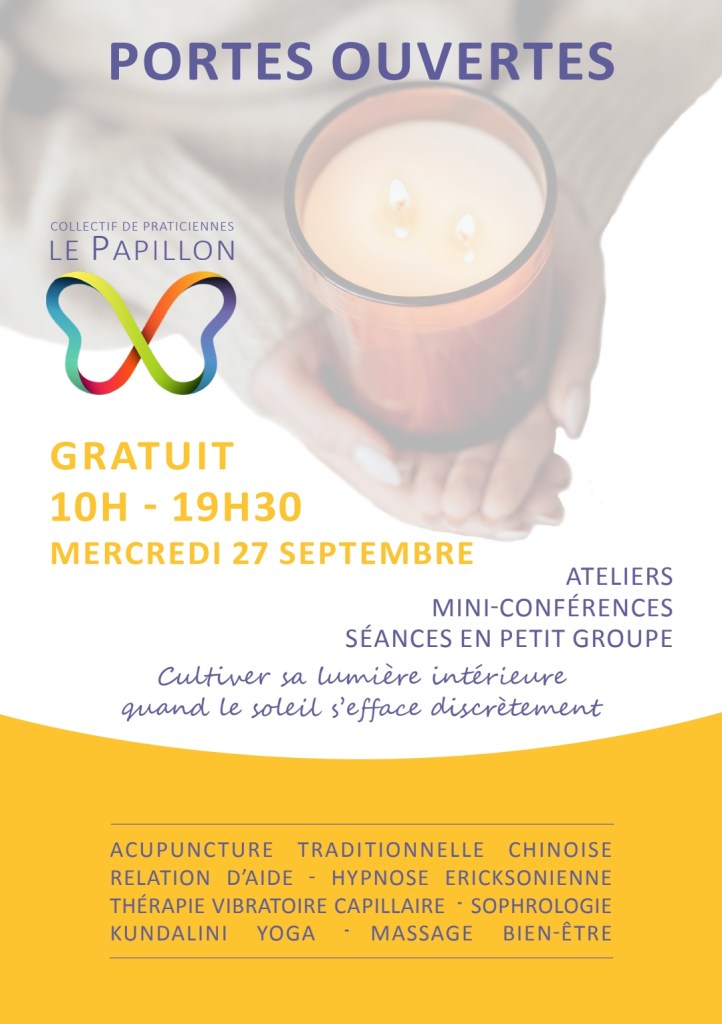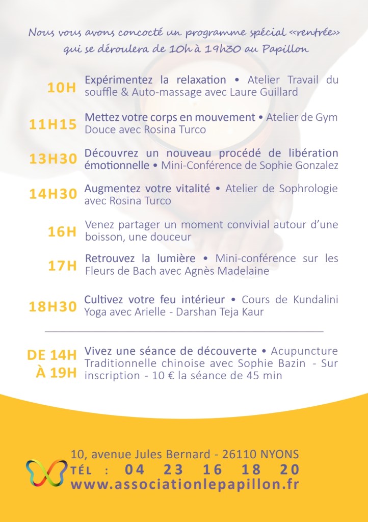 Les praticiennes du Papillon restent disponible tout l’été, si vous ressentez l’envie ou le besoin d’un massage bien-être, d’un cours de yoga, de méditation ou de sophrologie. A moins que vous préfériez vivre une expérience de libération émotionnelle avec la thérapie capillaire vibratoire, d’hypnose Ericksonienne ou un accompagnement verbal pour clarifier une situation, un besoin, avec ou sans l’aide des fleurs de Bach.